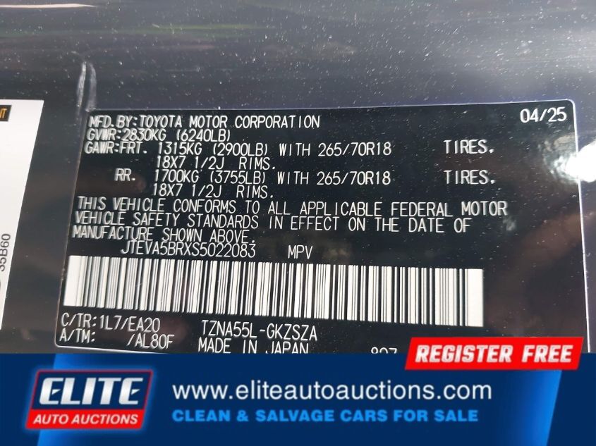 | VIN #: | JTEVA5BRXS5022083 |