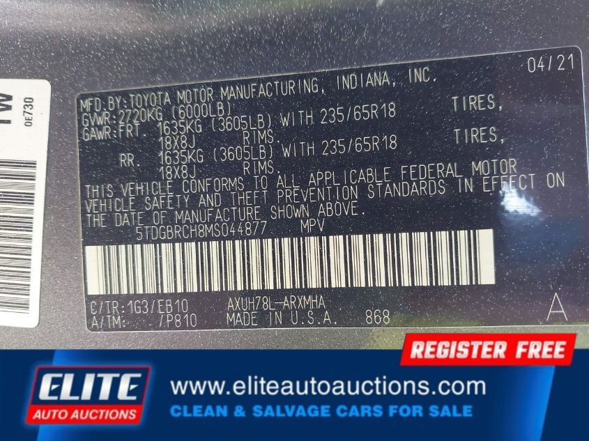 | VIN #: | 5TDGBRCH8MS044877 |