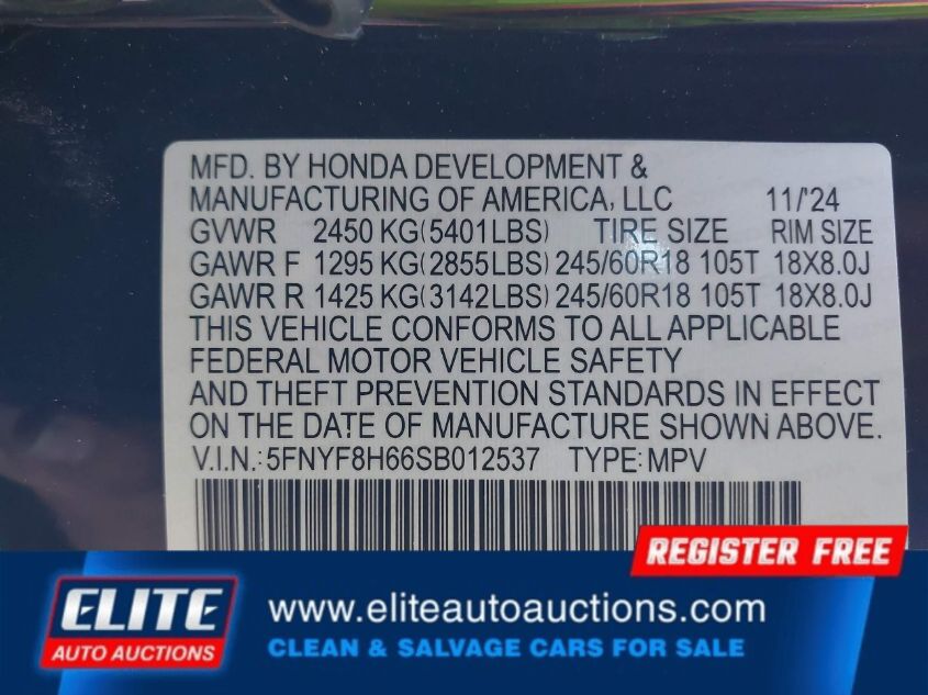 | VIN #: | 5FNYF8H66SB012537 |